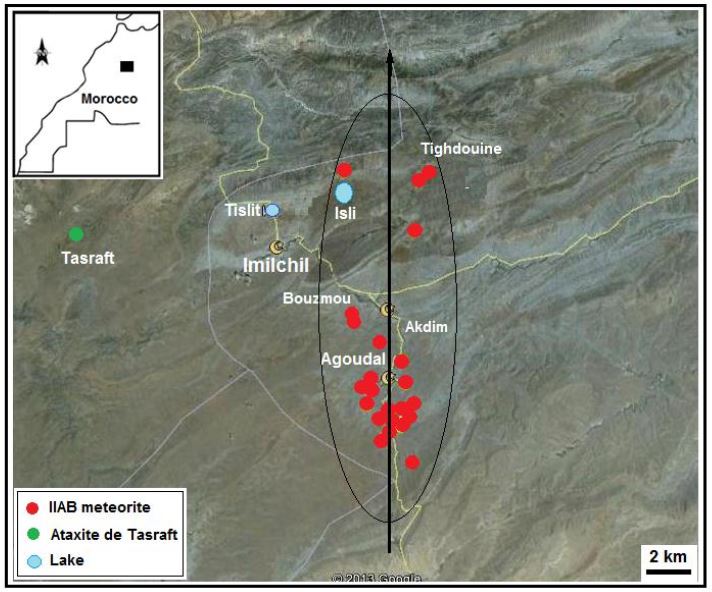 Histoire : en 2000, 2 petites pierres métalliques sont trouvées dans la région d'Agoudal au Maroc. En 2011 une autre pierre est vendue à un collectionneur. en 2012, une chasse au météorite est déclenchée. On retrouvera plusieurs centaines de pierre. la plus grosse faisant 60 kg trouvée à 50 cm sous la surface. Le hasard fait que l'on trouve également dans la région d'Agoudal des shatter-cones et des brèches d'impact, preuve d'un impact violent. Ce choc se serait produit pendant le jurassique. Le cratère d'impact a peut être été identifié en 2013.