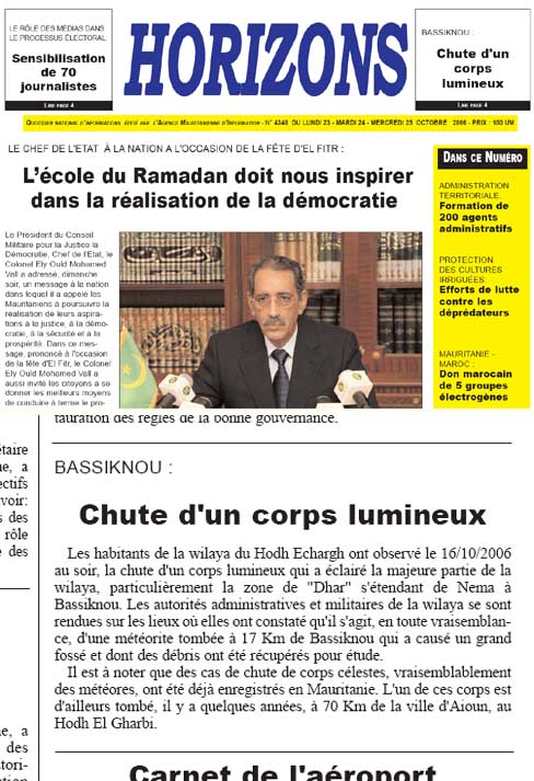 Histoire : C'est une chute observée le 16 octobre 2006 à 4h du matin par le peuple du Dhar Al Nema et les régions du Hodh Ech Chargui près du village de Bassilounou (2000 hab) en Mauritanie. En raison du petit nombre de témoin du phénomène lumineux, l'ellipse de chute est très approximative. Par contre le bruit a été entendu à plusieurs dizaines de kilomètre de distance, créant un début de panique dans les villages et à Bassikounou même. L'information de cette chute est arrivée en Europe qu'au printemps 2007. Un peu plus de 93 kg avait été retrouvé en juin 2007. Mais la massse principale n'est toujours pas découverte ainsi que de nombreux échantillons restent aux mains de l'armée mauritanienne. Ellipse de chute