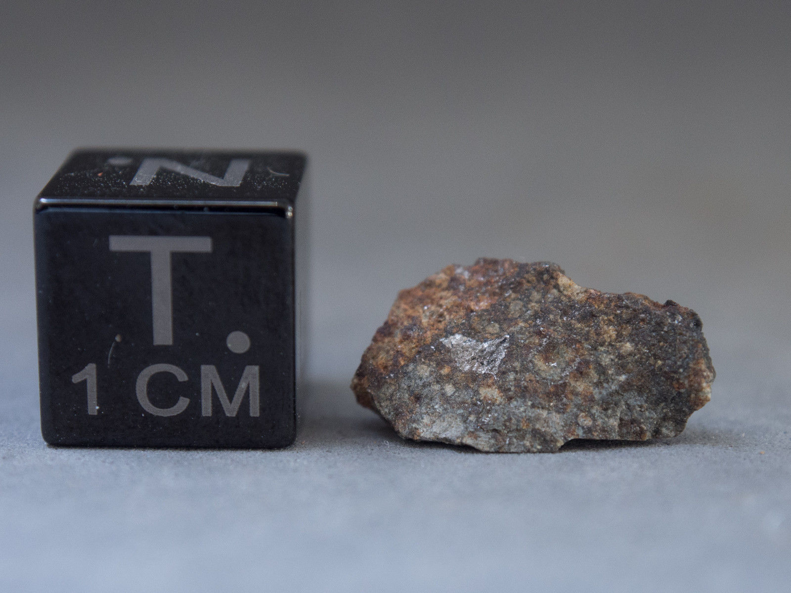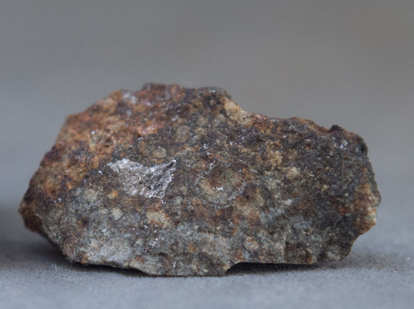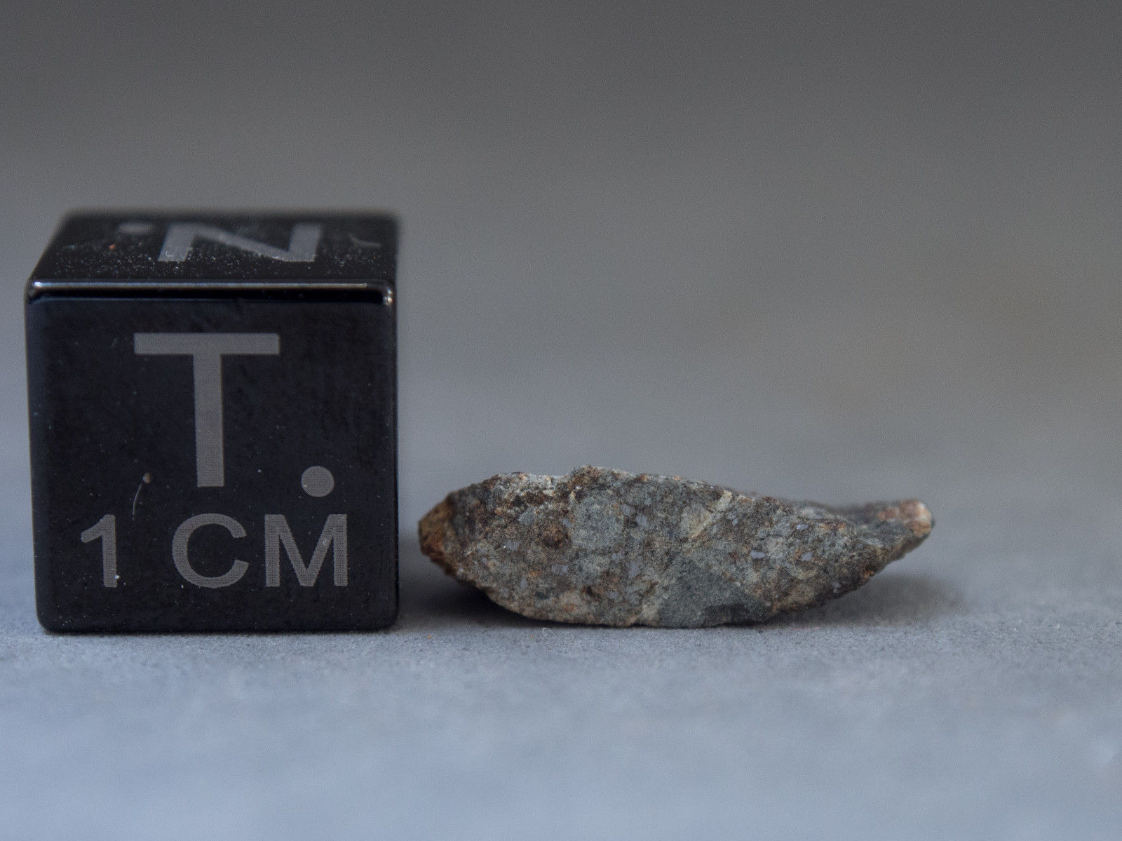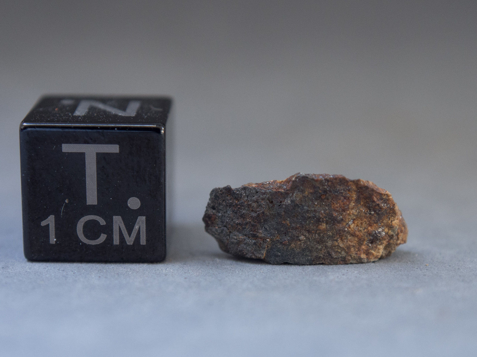 Caractéristiques physiques: Un seul fragment angulaire, couvert ~ 30% par une croûte de fusion relativement fraîche. Couleur grise avec petites taches de rouille. Surface intérieure parfois recouverte d'une croûte de carbonate. Petite patine visible. Quelques petits grains de quartz arrondis insérés dans les fissures, avec une matrice de sol orange clair.