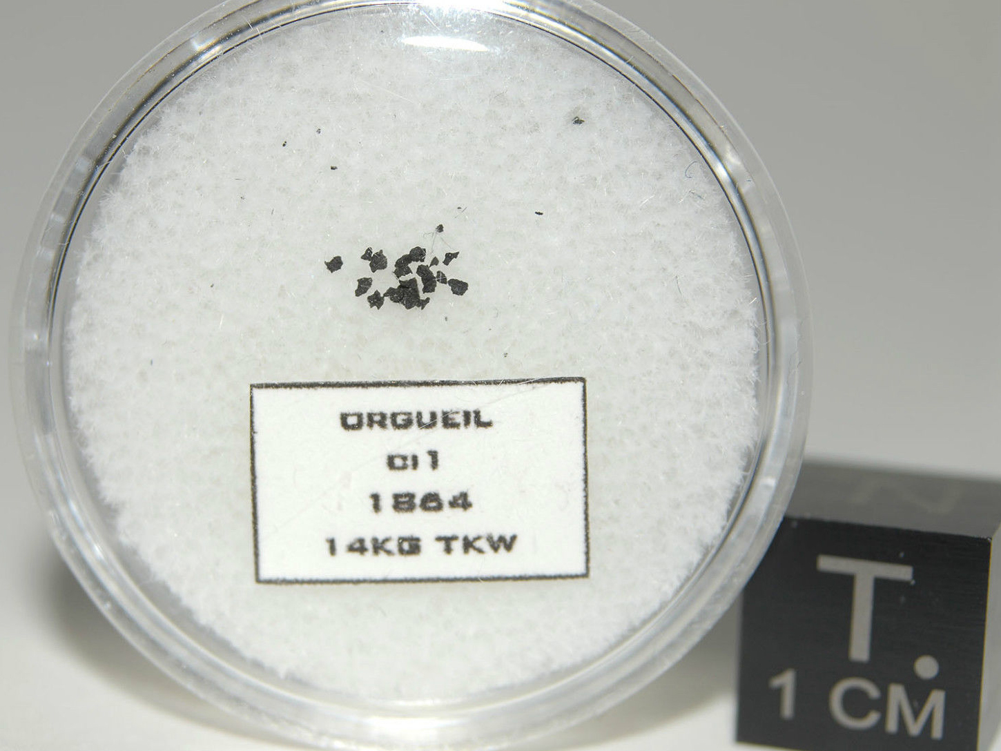 Histoire : Le 14 mai 1864 vers 20 h, un météore traverse le ciel français. Il est vu de l'Eure à Bordeaux. Après avoir survoler la ville de Montauban, il explose au dessus de la commune d'Orgueil. 14 kg sont récupérés. Il s'agit de la première Chondrite carbonée découverte. Il s'agirai d'un fragment de comète. Elle contient des acides aminées, des grains pré-solaire et 20% d'eau. cette eau en s'évaporant délite la méteorite ce qui rends sa conservation très difficile. Elle se serai formé il y a 4.5 milliard d'années et sa composition est identique à celle du soleil (les gaz en moins). En 1962, une étude américaine d'un exemplaire de cette météorite découvre des particules marrons de quelques millimètres ressemblant à des graines ainsi que des petits morceaux de charbons contenant une forte teneur en acides aminés. L'origine extraterrestre de ces particules semble être confirmé, car la météorite a été conservée sous une cloche scéllée à l'abri d'une contamination extérieure. En fait il s'avera que les acides aminés provenait d'une colle et les graines étaient des graines de roseaux de la région de Montauban. En 1864, une supercherie avait été orchestré en collant des petits morceaux de graines et de charbon sur ce spécimen !