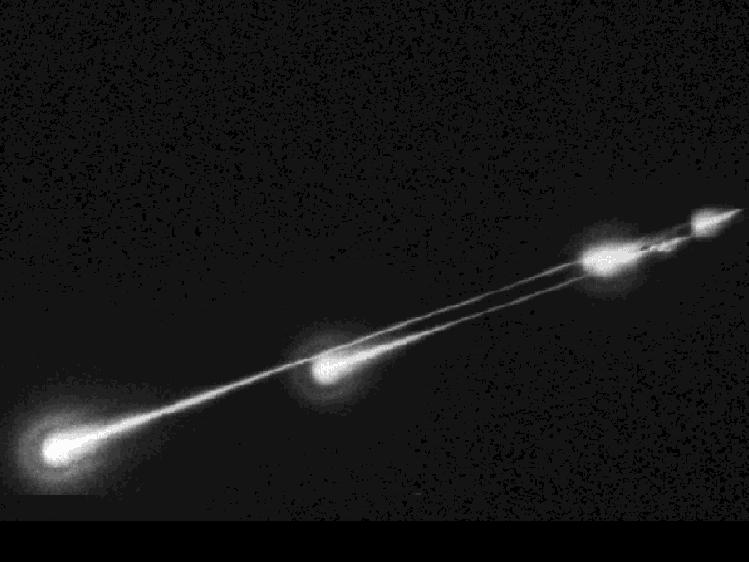 Histoire : Les événements entourant la chute de la météorite Peekskill le 9 octobre 1992 sont tout à fait remarquables. Non seulement la météorite percute à son arrivée une voiture garée dans la banlieue de Peekskill, dans l'état de New York, mais aussi par les 16 vidéos amateurs ayant filmé l'arrivée de la boule de feu. Les témoignages indiquent que la boule de feu est d'abord apparu en Virginie Occidentale à 23:48 UT. en direction approximativement du nord-est avait une couleur verdâtre prononcée et a atteint une magnitude visuelle maximale évaluée à - 13 (Equivalent à la Lune). Photo de la chute de la météorite de Peekskill Pendant une durée de 40 secondes la boule de feu a couvert environ 700 à 800 km. À 19 h 50, dans la petite ville de Peekskill à 50 km de New-York, un bruit violent fit vibrer les vitres des maisons. Michelle Knapp se précipita à la fenètre et vit le coffre de la voiture de son ami défoncé. Elle appela la police qui constata le délit. Le coffre avait été transpercé par une pierre qui fut retrouvé au sol. L'automobile fut vendue et devint une grande voyageuse. Elle fut exposée lors de l'exposition « Météorites » au Museum de Paris en 1997.