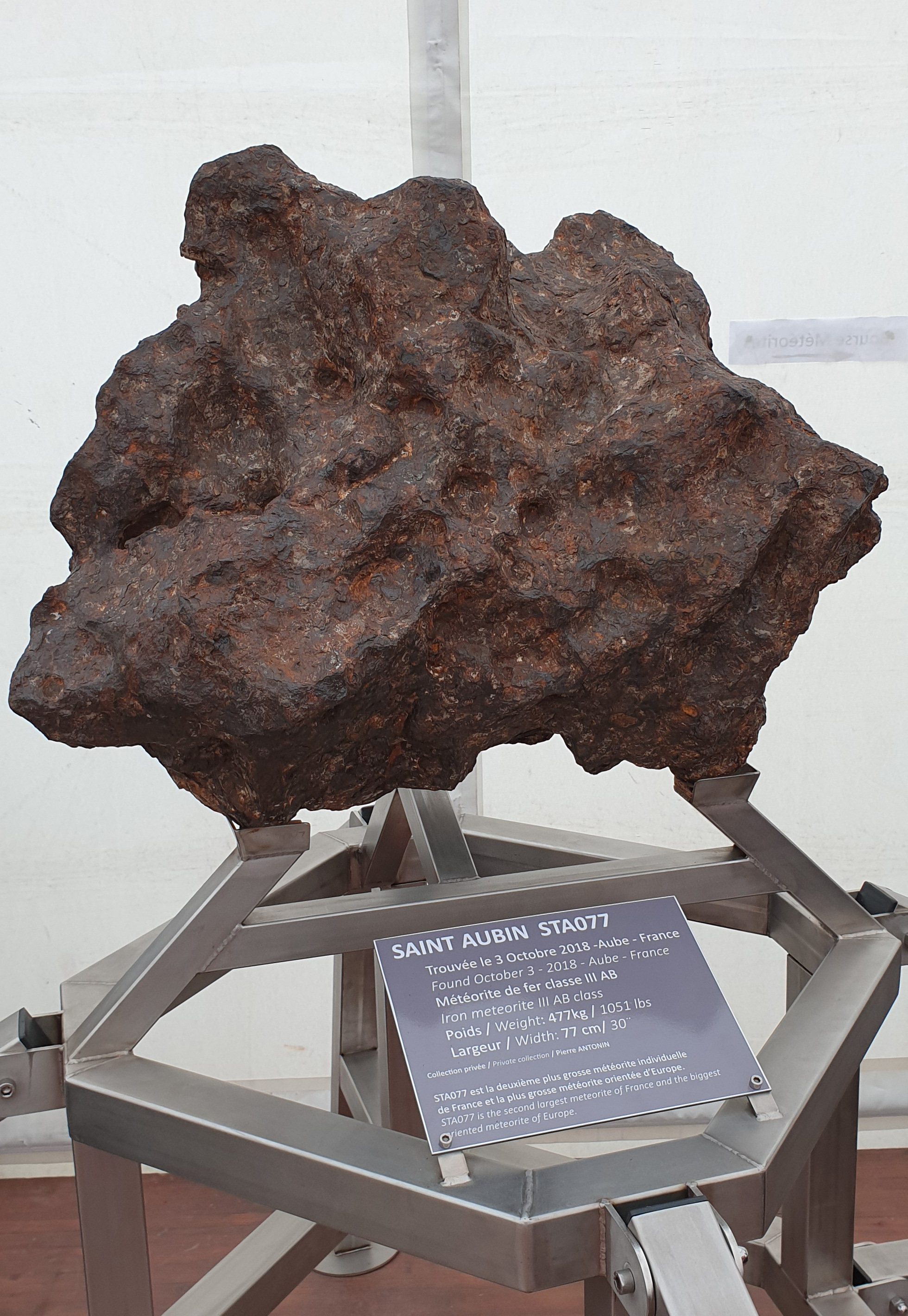 Histoire: Cette météorite a été découverte en 1968 dans un champ près du village de St Aubin dans l'Aube. Une petite partie de la masse métallique emmergeait du sol et elle fut extraite par le propriétaire du champ qui découvrit une masse total de 170 kg. Cette pierre est résté 35 ans dans la cour de la ferme, jusqu'à son expertise en 2002, qui prouva son origine extra terrestre et sa composition. D'autres morceaux furent retrouvés dans une ellipse de chute de 8 kms pour un poids total de 472 kg repartis en 5 masses de 170, 144, 67, 65 et 26 kg. La chute a été probablement observée en octobre 1865. En novembre 2001 une pierre de 53 kg fut retrouvée. présageant d'autre spéciments à découvrir. En 2018, une équipe muni d'un détecteur de 22 m2 tractée par une voiture, explora une zone de 150 hectares et découvrit environ 6500 kg de fragments et en particulier un morceau de 477kg. L'ellipse de chute à pu être estimée à 1060 m x 925 m