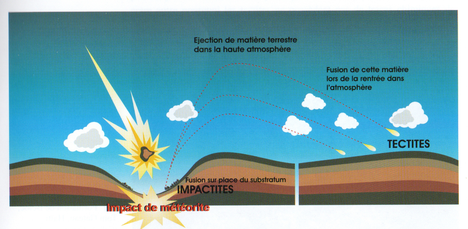 Histoire: Les tectites (du grec têktos, fondu) sont de petits globules de verre naturel, souvent en forme de coupe ou de goutte, de quelques millimètres à quelques centimètres. Elles contiennent de 70 à 80% de silice, 3 à 16% d'alumine. On les a longtemps considérées comme des météorites, et on s'est interrogé sur leur origine. Ce problème a été résolu récemment, en partie grâce à leur répartition géographique : elles se répartissent à la surface de la Terre dans des zones de forme elliptique. Ces zones sont associées à des cratères d'impact, et leur âge est le même que celui du cratère. Ce ne sont donc pas des météorites, mais des matériaux terrestres fondus. Lors de l'impact d'une météorite assez importante, la chaleur produite par le choc a fondu le sol terrestre, qui s'est vitrifié et a été projeté sous forme de gouttes. Ces gouttes sont retombées plus loin sur une surface elliptique à l'opposé de la direction d'arrivée de la météorite. Certaines sont projetées tellement fort, qu'elle sortent de l'atmosphère, pour aller retomber des milliers de kilomètres plus loin. En retombant dans l'atmosphère, ces tectites fondent à nouveau, et garderont les traces de cette double fusion. On connaît 4 champs de tectites dans le monde :