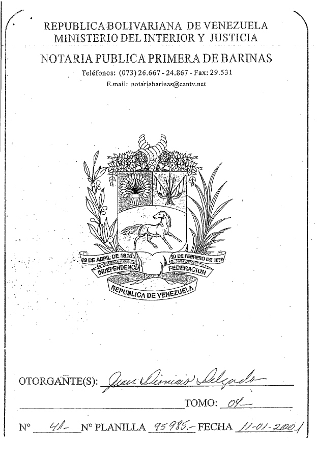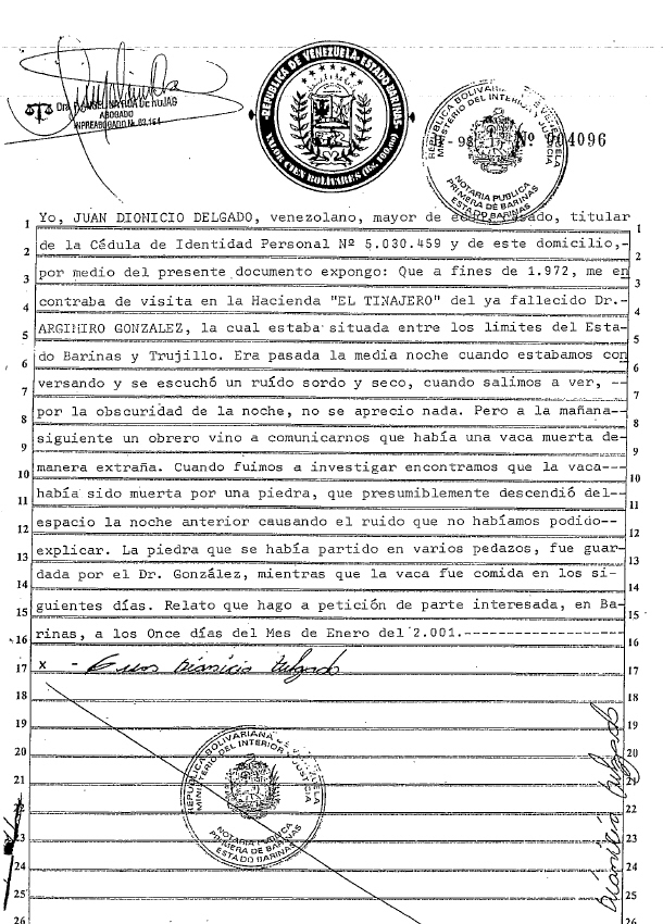 Histoire: Dans la soirée du 15 octobre 1972, près de la ferme El Tinajero une lumière brillante accompagnée d'un bruit fort est observée. Le lendemain matin, le Dr Arginiro Gonzales et son invité, Juan Delgado Dionicio, découvrent qu'une vache a été apparemment tué par une météorite. La pierre s'est brisée en trois morceaux pesant 38, 8 et 4 kg. Le plus grand des 3 morceaux est resté à l'extérieur pendant des décennies. Conservée dans la ferme elle fût analysée en 2000 par A.Rubin de l'Université de Californie, il s' agit d'une chondrite L5. Le vétérinaire qui avait constaté la mort de l'animal a fait une déposition chez un notaire public pour authentifier l'événement. Traduction en français : Moi, Juan Dionicio Delgado, Venezuelien, identifiés par le document nationale n ° 5.030.450, par le présent document, je déclare que, à la fin de 1972, je visitais la ferme "EI Tinajero" détenue par Argimiro Gonzalez, décédé, qui est situé dans les limites des états de Barinas et Trujillo. Il était minuit passé quand nous parlions, et il y eu un bruit étrange. lorsque nous sommes sortis pour enquêter à cause de l'obscurité de la nuit, nous avons rien vu. Mais le lendemain matin un ouvrier venu pour dire qu'il avait trouvé une vache tuée dans des circonstances étranges. Quand nous sommes allés pour enquêter nous avons constaté que la vache avait été tuée par une pierre qui était sans doute tombé du ciel la nuit précédente, provoquant le bruit que nous n'avions pas été en mesure d'expliquer . La pierre qui avait été cassée en plusieurs morceaux, a été conservée par le Dr Gonzalez, tandis que la vache a été mangé dans les jours suivants. Histoire que je raconte à Barinas, le 11 Janvier 2001.
